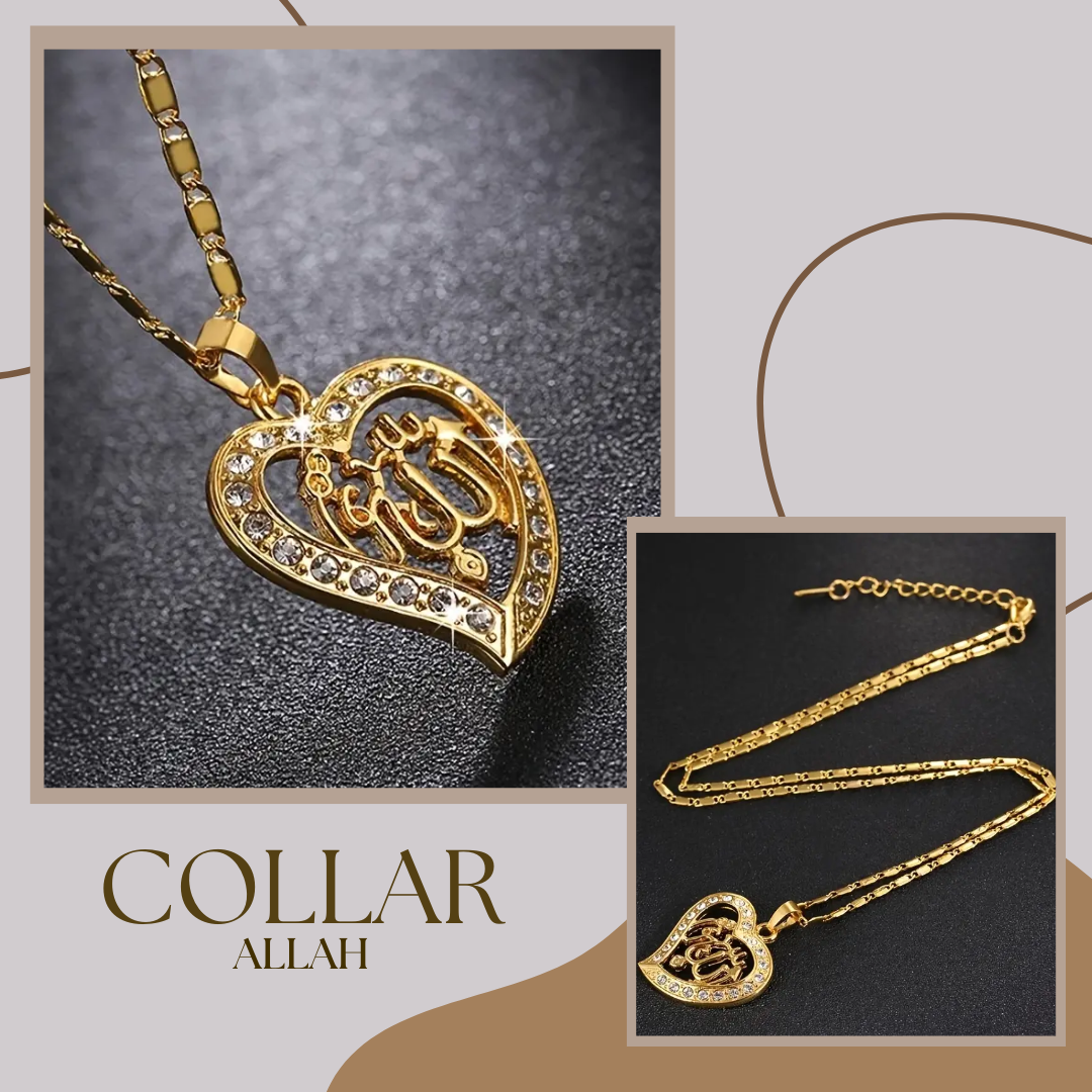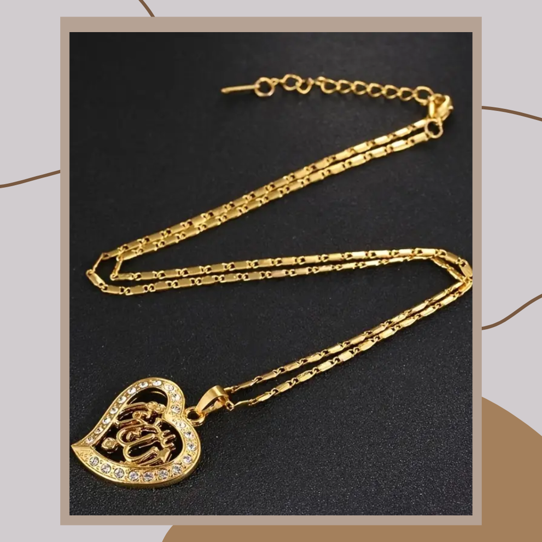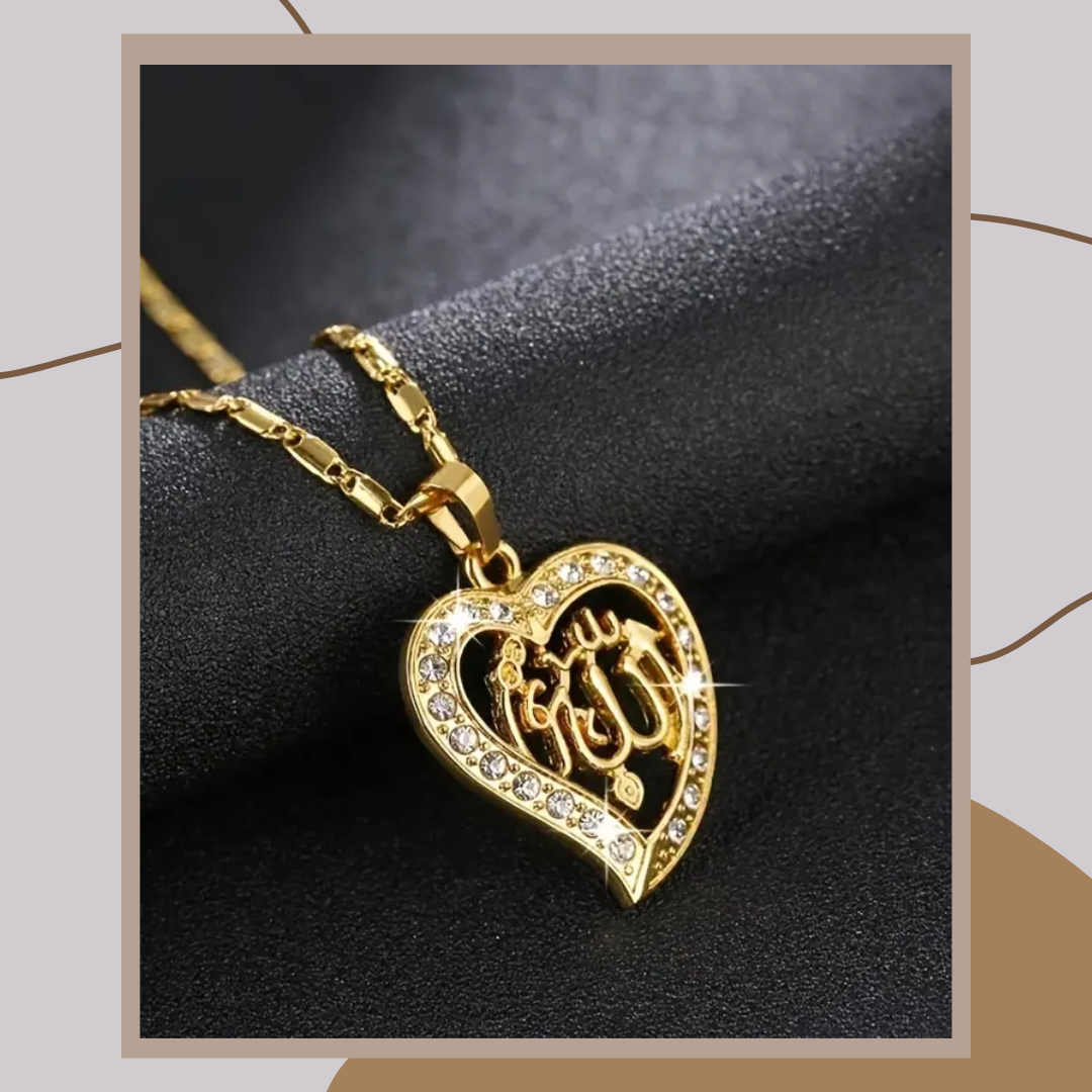 Este collar combina elegancia y significado en una sola pieza. Elaborado en acero inoxidable dorado, ofrece resistencia, brillo duradero y un acabado pulido. Su dije en forma de corazón está adornado en el borde con piedras brillantes, que aportan un toque delicado y luminoso. En el centro destaca una fina caligrafía árabe Allah, creando un diseño armonioso y distintivo.