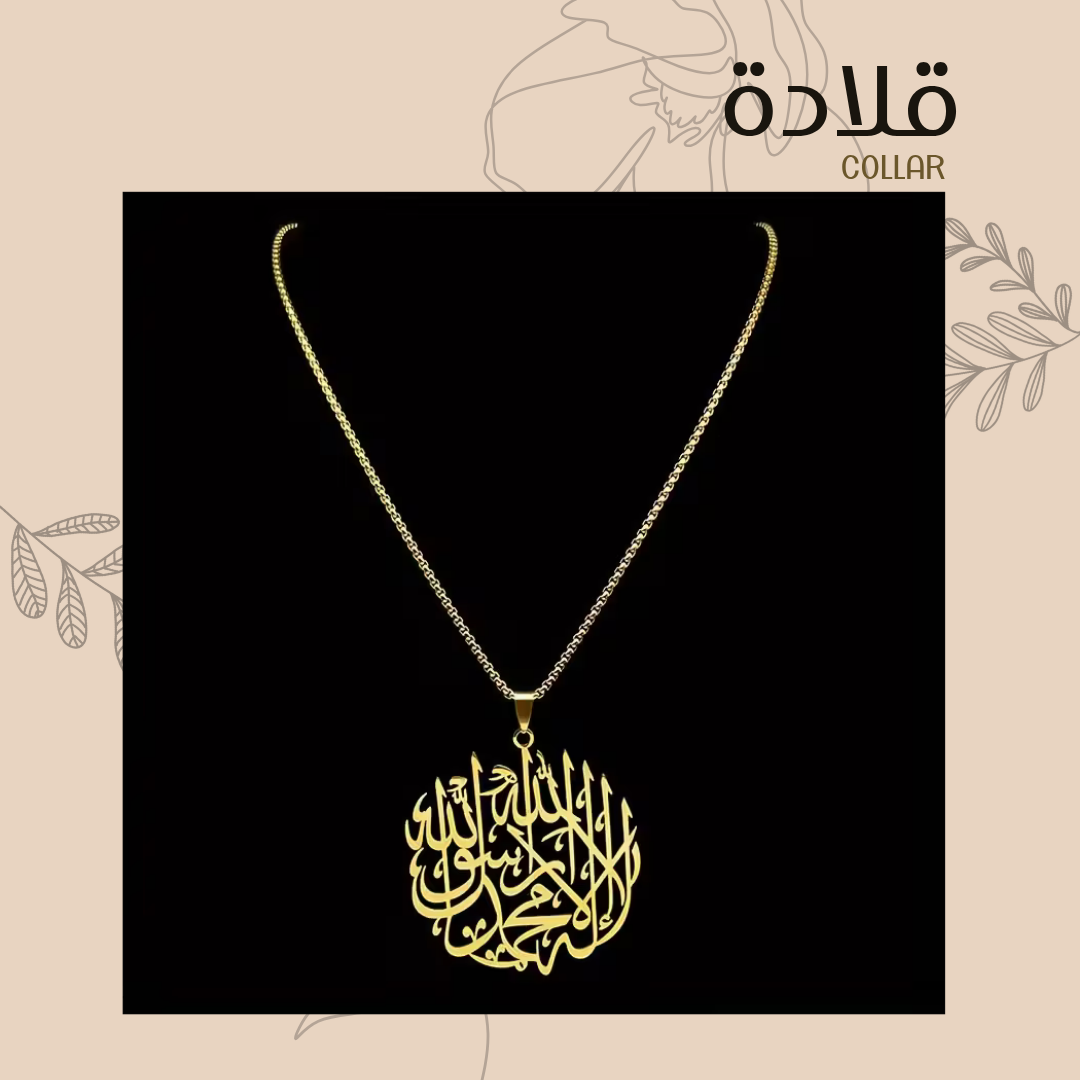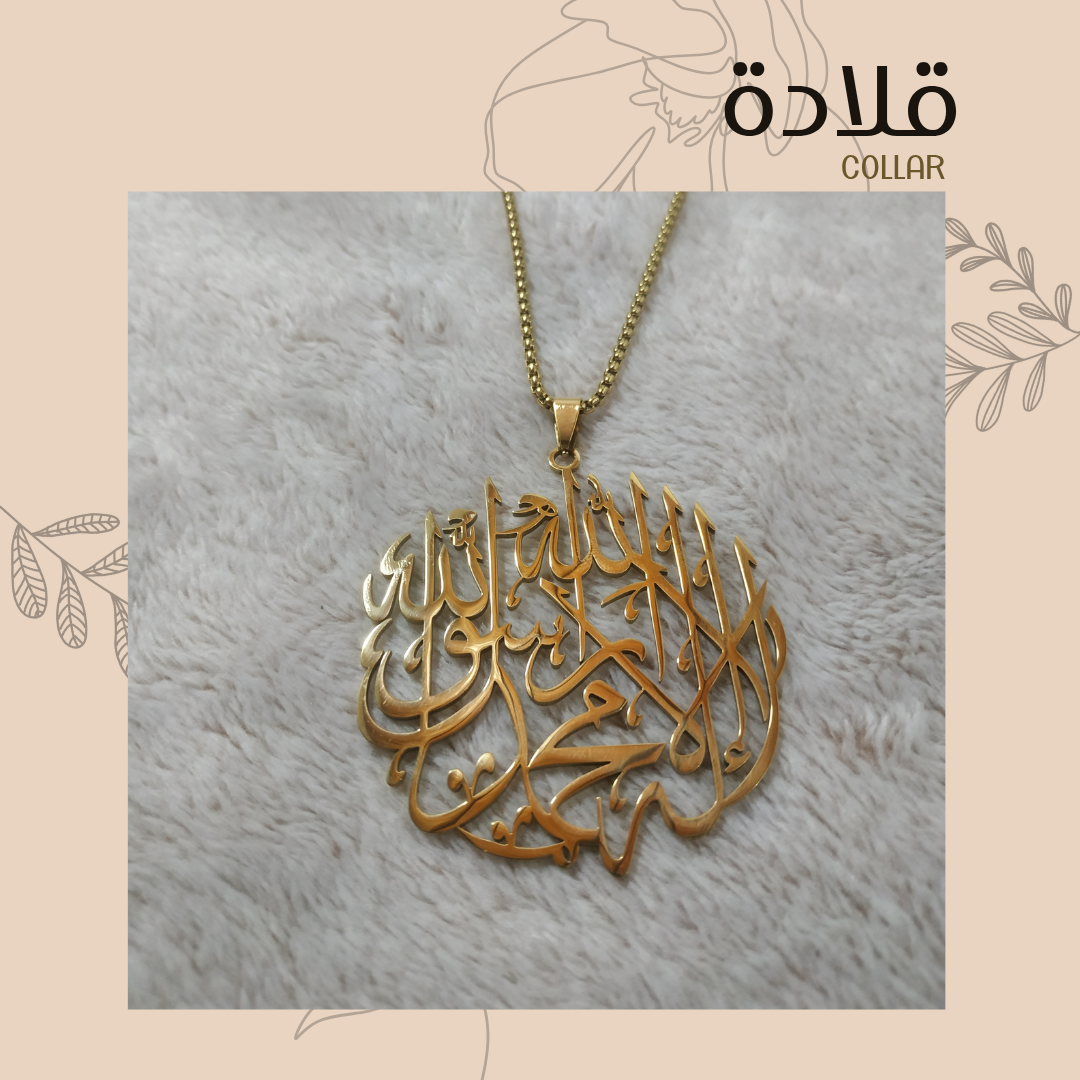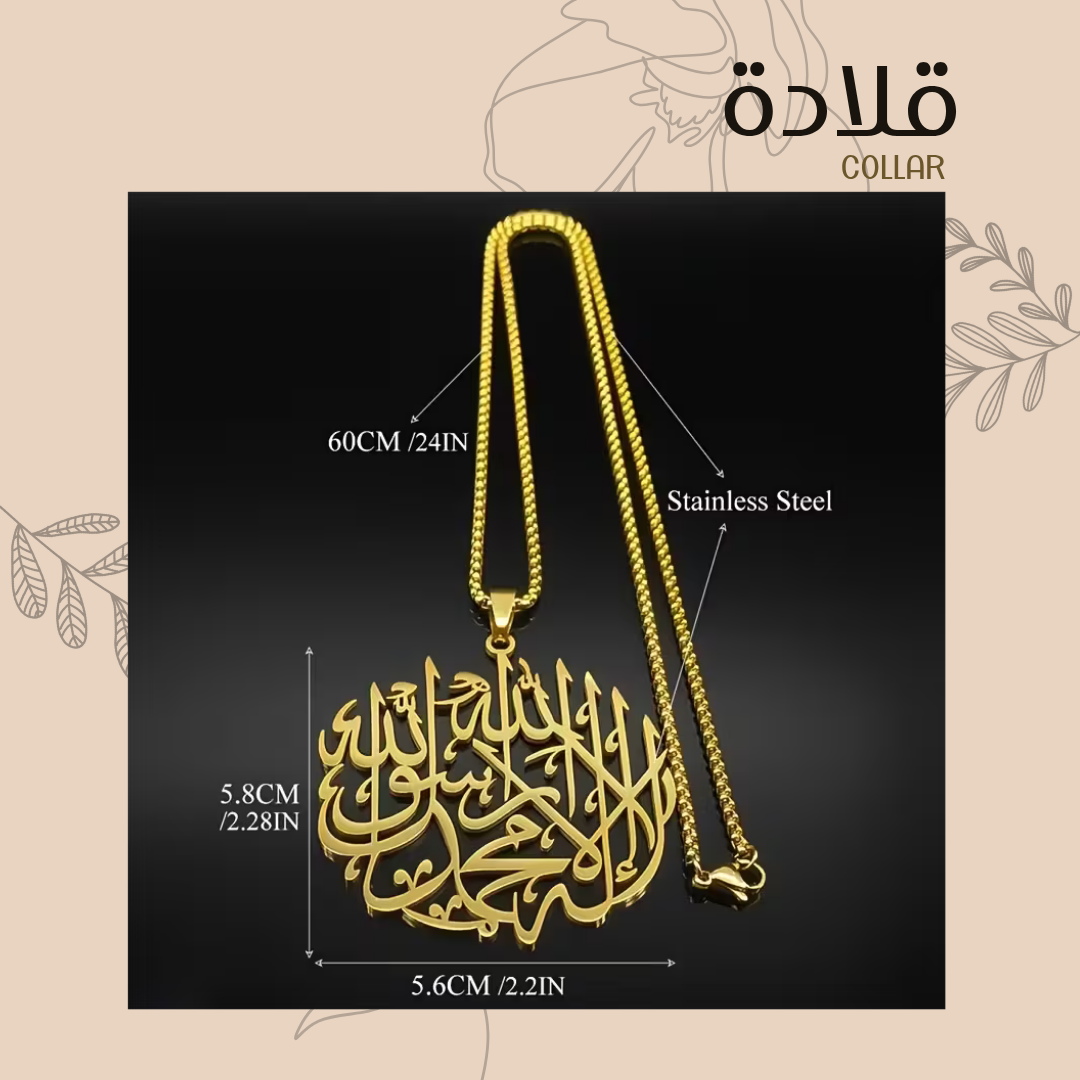 Collar dorado en acero inoxidable con un colgante grande de caligrafía árabe en diseño circular. El texto grabado corresponde a la frase لا إله إلا الله محمد رسول الله, cuyo contenido es Lā ilāha illā Allāh, Muḥammad rasūlu Allāh y su significado es No hay más Dios que Allah y Muhammad es el mensajero de Allah.
