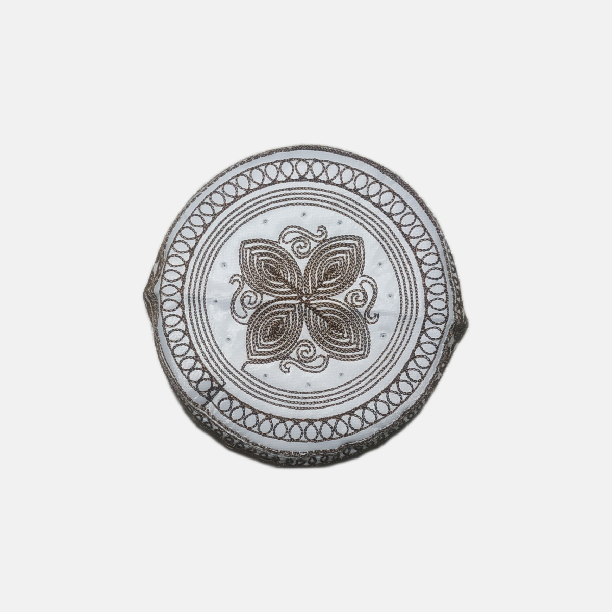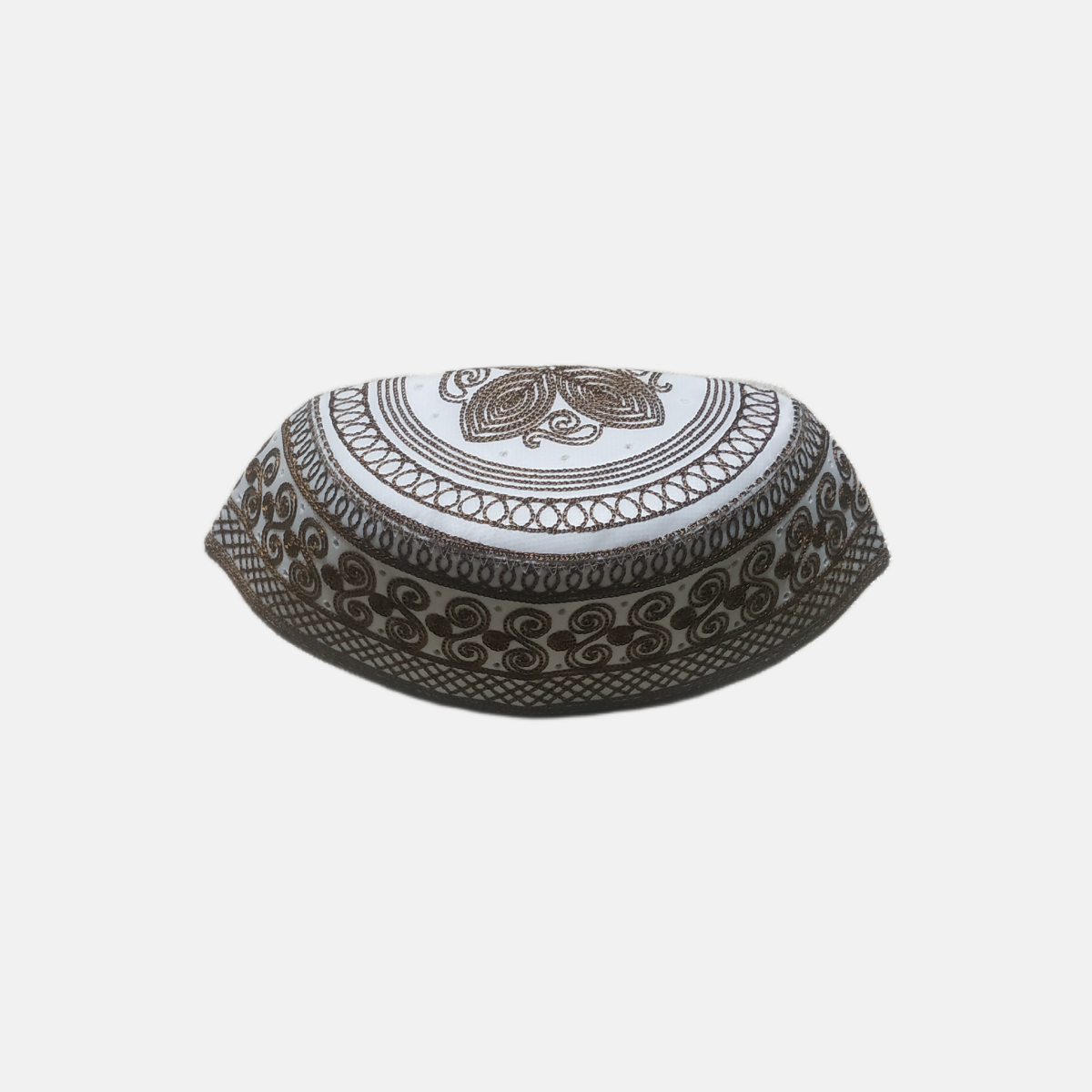 El Gorro Kufi árabe artesanal blanco con bordado marrón es una pieza tradicional confeccionada a mano por artesanos expertos, quienes combinan técnicas clásicas y detalles cuidadosamente elaborados. Su color blanco aporta un estilo limpio y elegante, mientras que el bordado marrón resalta patrones inspirados en la cultura árabe.